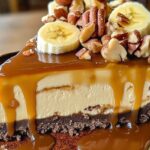Imagine a rich, creamy cheesecake infused with the sweetness of ripe bananas, layered over a crunchy chocolate crust, and generously draped in golden caramel sauce. Each bite delivers a perfect balance of textures—the smoothness of the cheesecake, the crispness of the crust, and the nutty crunch of pecans and almonds. Topped with fresh banana slices and a drizzle of caramel, this dessert is an indulgence for those who appreciate the finer things in life.
