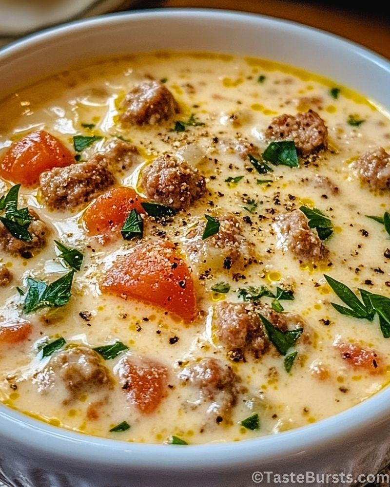 A bowl of Creamy Parmesan Italian Sausage Soup is the ultimate comfort food, blending savory Italian sausage with a rich, velvety broth infused with Parmesan cheese. This soul-warming dish combines the bold flavors of garlic, onions, and perfectly seasoned sausage, with the creamy texture of heavy cream and the subtle tang of tomatoes. Each spoonful is packed with bursts of flavor, making it a satisfying meal perfect for chilly nights or whenever you’re craving something indulgent.